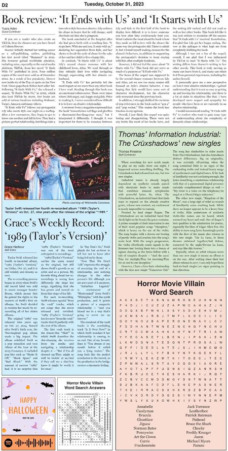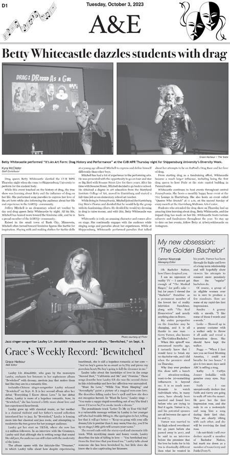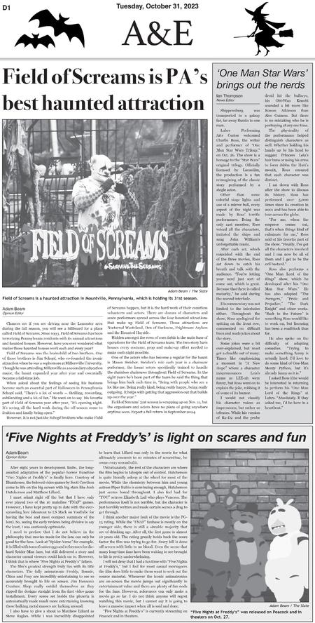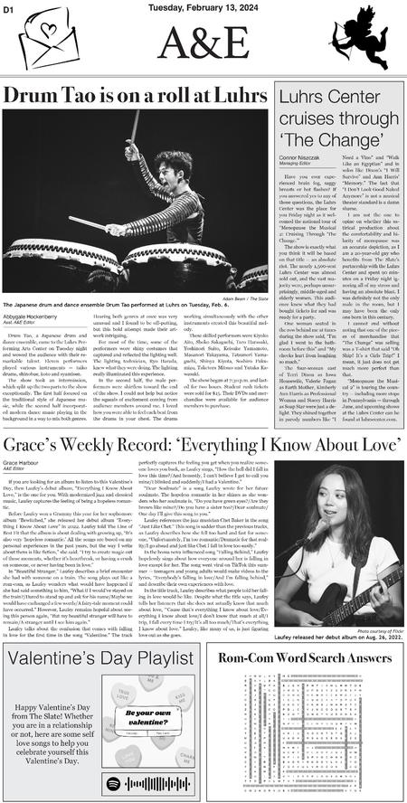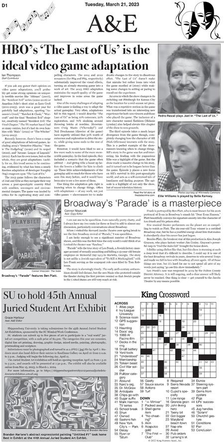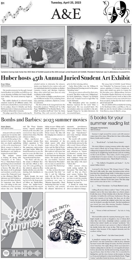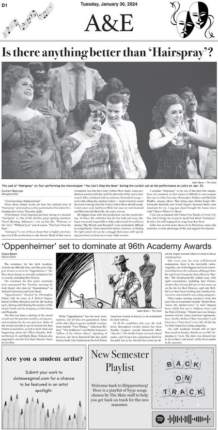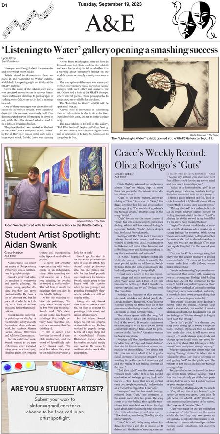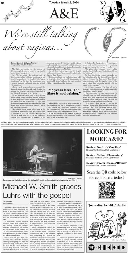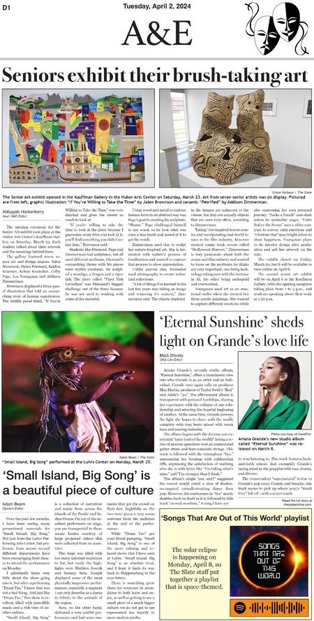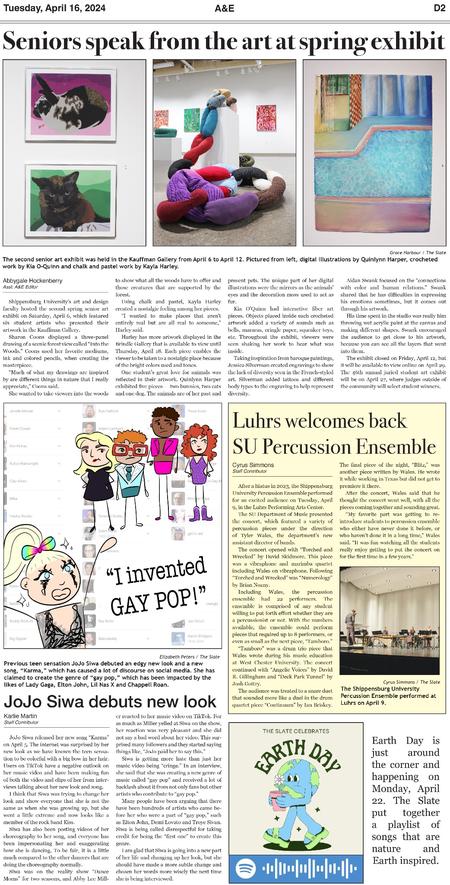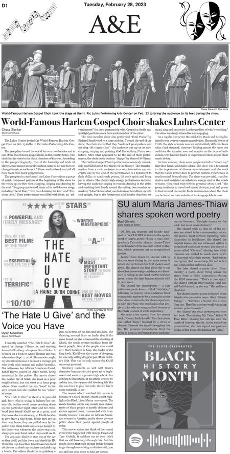 Throughout three semesters, I contributed 30 pages to the A&E section of The Slate. Below are samples of layouts that highlight the development of my page design skills over this period.